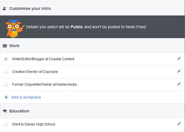 - Make the changes you need, add work and school details and interests or whatever you need.