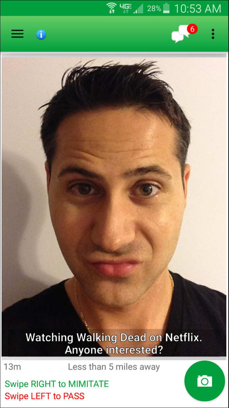 You’re probably familiar with the term “Netflix and chill,” a dating euphemism meme that essentially refers to asking someone of your preferred sex to come over to “watch Netflix,” which will inevitably lead to an episode of Parks and Rec playing in the background while you, er, chill. The phrase grew throughout the country’s lexicon so much, became so common, an app was invented solely for the purpose of “chilling.” This app, Mimitate, is simple enough: men post a selfie of themselves watching their favorite content on Netflix. If someone is interested in your selfie, they can initiate a chat. The app’s a great premise, but a lack of recent updates and reviews on the iTunes listing tells us the market for Mimitate might just not be there. Still, it’s worth trying, especially if you’re interested in finding someone who loves binging Orange is the New Black as much as you do.