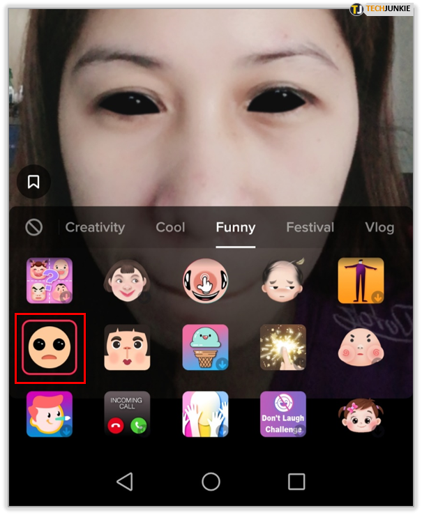 If you want to turn your eyes completely black, you can do that as well. Just a fair warning before you do it, as the result can be quite spooky. But maybe that’s what you’re trying to achieve, in which case scroll through the “Funny” tab until you find a smiley with pitch black eyes. Tap it and witness the change!