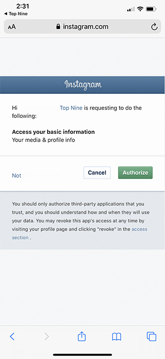 After entering your email (or bypassing the process altogether), you’ll be redirected to your phone’s browser and asked to log into your account. Top Nine will then request to access your basic Instagram information, including your media and profile info.