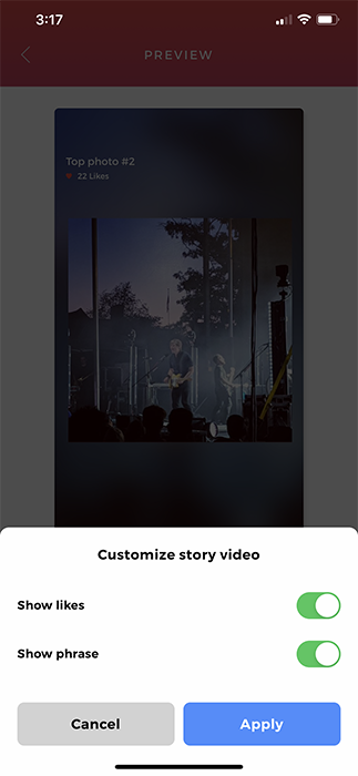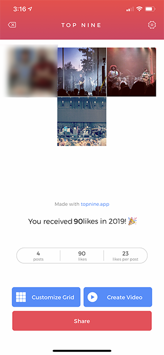 The app also collects the number of likes you’ve earned throughout the year, along with a rough average of likes per post. If you’re really into seeing just how many likes you earn on a post, this is a fantastic feature. If not, don’t worry—you can turn this off before sharing your Top Nine to your social media.