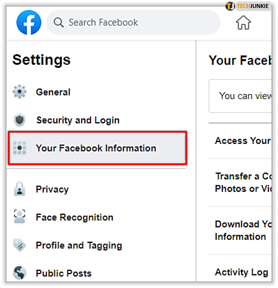 From the left sidebar, click on Your Facebook Information. You’ll find it below the General and Security and Login options.