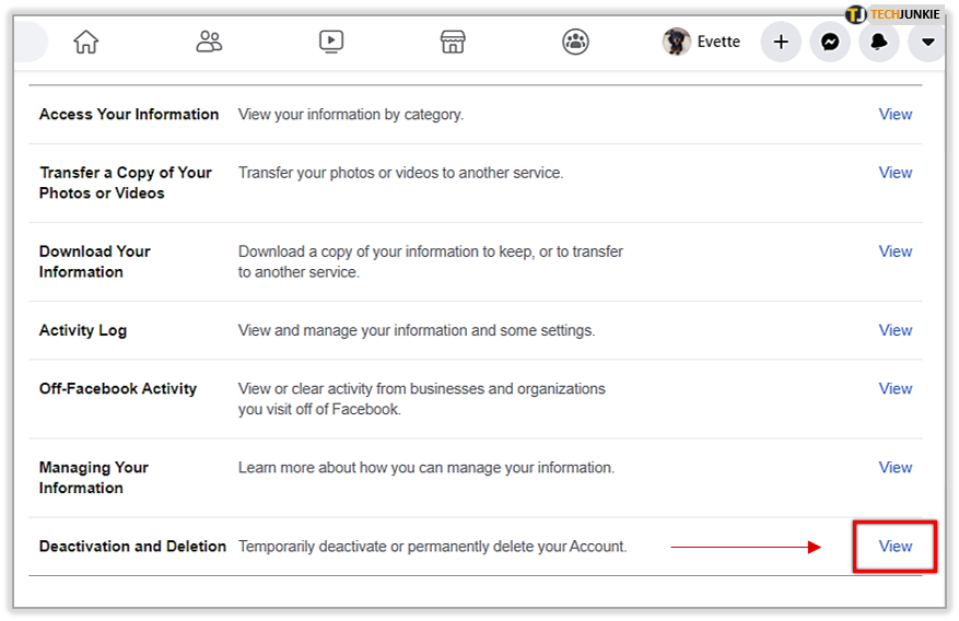You’ll now find a page that will list your Facebook information. You can see your information listed by categories here and also check your activity log. To deactivate your account, click on View next to Deactivation and Deletion.