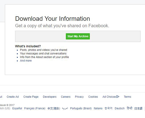 Load up Facebook’s desktop website and, at the top of the page, find the small down-facing triangle menu button in the upper-right hand corner of your display, tap it, and select “Settings.” This’ll load a bunch of different options, and at first glance, it can be a bit overwhelming. Ignore everything and tap the menu option labeled “Your Facebook information” and then “Download your information.” This will then load you to a page that details everything in your account included in your download.