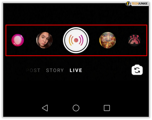 - Scroll left or right on the options on the bottom of the screen until you see Live. Tap on Live.
