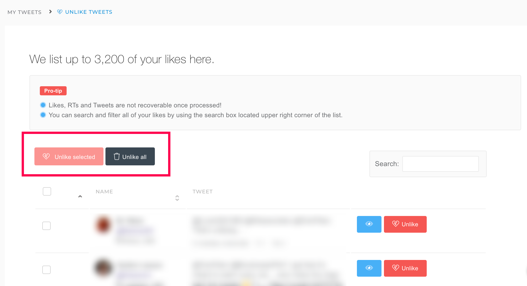 - Click Unlike All. Or, click the checkboxes to the left of each tweet you want to unlike and select Unlike Selected.