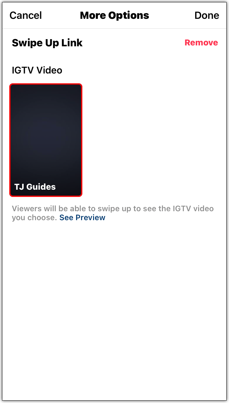 Your video will have its preview with a swipe up link in your stories so that every follower can watch its beginning and continue on your IGTV channel.