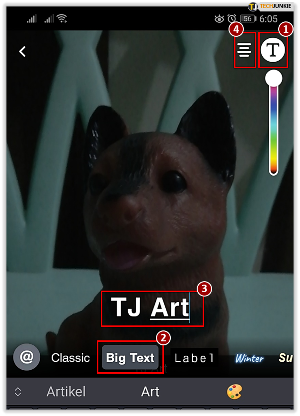 Tap on the T icon at the top right of the screen and select Big Text from the pop-up menu. Type your message and select the positioning by tapping on the alignment icon. You’ll find it in front of the large T at the top of the screen.