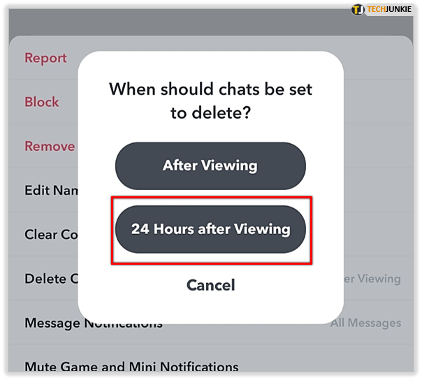 Navigate to chats in Snapchat and select a conversation. Click the icon next to their name. On the next screen, tap the three-dots icon and then navigate to Delete Chats. You’ll have two options here: After Viewing and 24 Hours after Viewing. Select the latter to have each message inside that chat stay for 24 hours after everyone has seen it.