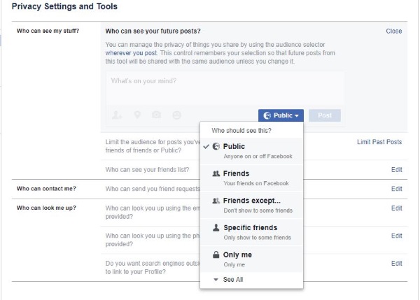 If you are happy to be found and communicated with, leave the settings at Everyone or Public. If you want to restrict access, make changes as you see fit. For example, in Who can see my stuff, you can select Public to allow everyone to see everything, Friends, which restricts viewing to your Facebook Friends or Friends Except which allows you to further filter who can and cannot see your stuff.