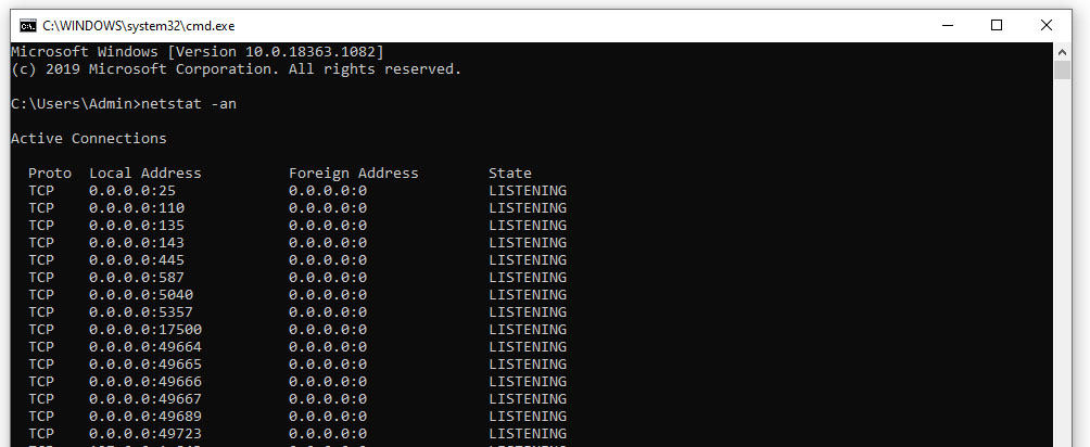 - When the Command Prompt launches, type “netstat-an” in the command line and press the “Enter” button.