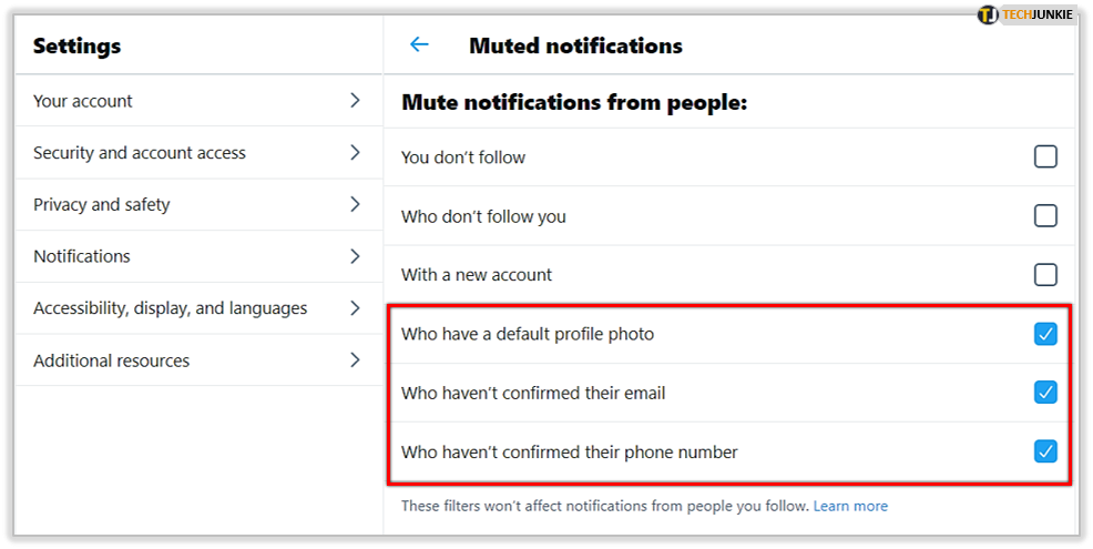 - Mute Notifications from People who have a default profile photo, who haven’t confirmed their email, and who haven’t confirmed their phone number.