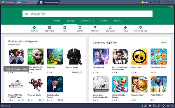 When you enter your login information for Google Play, you’ll be redirected back to the app, now able to install apps and launch content from within the store. Unlike the BlueStacks App Store, Google Play is entirely unchanged here. If you’ve ever used Google Play on a tablet, you’ll know what to expect here; the app is identical. You can search through apps at the top of the browser, select one of the options from the carousel of highlighted apps and games at the top of the screen, and scroll through the suggested games below. More importantly, however, is the ability to access your own account. Use your mouse to select the horizontal triple-lined menu button that will be familiar to any long-time Android user to open the sliding menu to the left of your screen. Since you previously logged into Google Play when first launching the app, you’ll see your standard number of options appear inside BlueStacks’ terminal, including your account name, your library of apps and games, and the ability to browse suggested categories like books, movies, and more.
