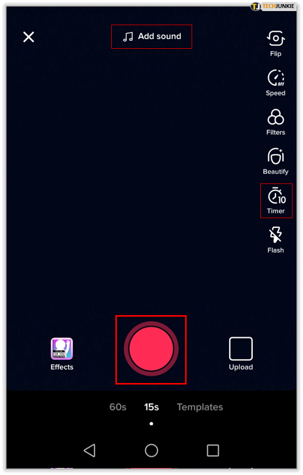 - TikTok will use your camera to start recording. Prior to doing so, feel free to add some music for the background. Of course, you can do that later if you want to record the video first. You can also use the video timer option if you want to record hands-free.