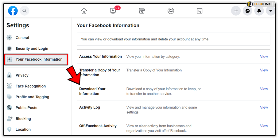 - When the setting page loads, click on “Your Facebook Information” on the left side bar then select “Download Your Information” from the options.