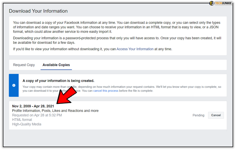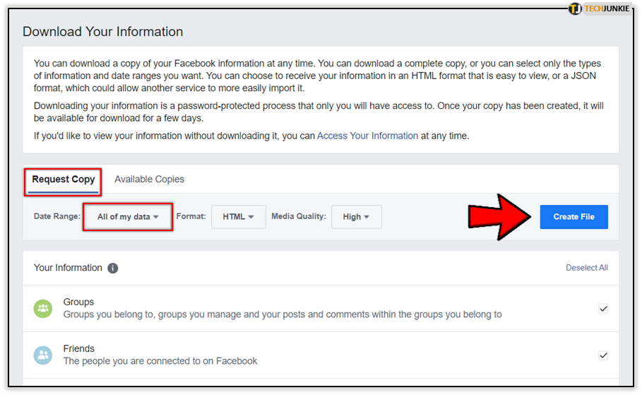 - Choose “Request Copy”. On the Date Range, select “All of my data” then click on “Create File”. All data, including your conversations, will be downloaded to your computer.